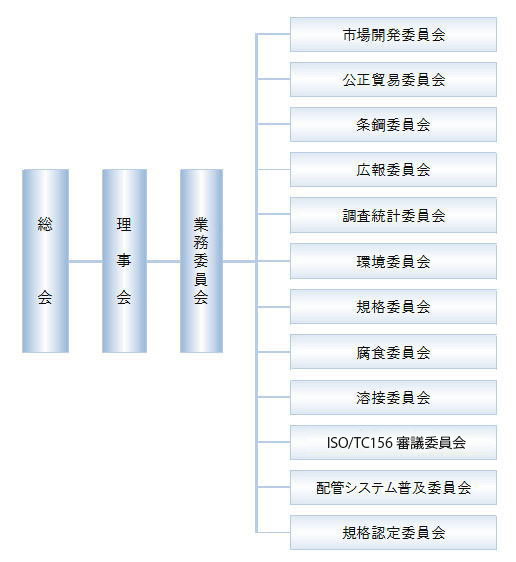 | 会員 | (1) 正会員 (鋼材メーカー、溶接鋼管メーカー、商社) 23社 (2) 特別会員 (建材加工・流通、溶接材、管継手メーカー) 32社 (3) 賛助会員 13社 (4) 団体会員 (全ス連・JSCA) 2団体 合計 68社 2団体 |