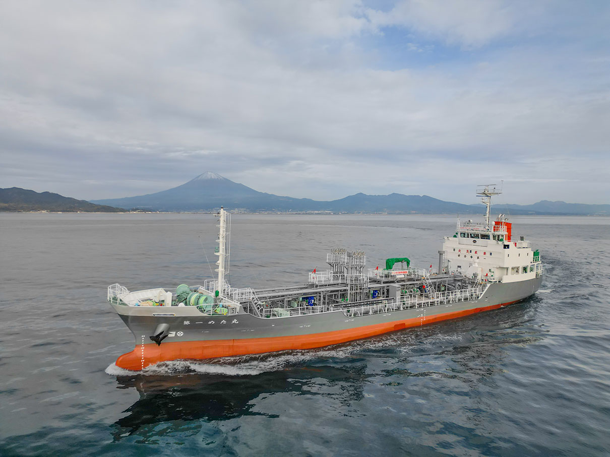 「第一めた丸」は国内で初めてメタノールを燃料とする内航船です。現在、国内のメタノール輸送に従事していますが、燃料にメタノールを使用する事でSOxやCO2、NOxの排出量を大幅に削減した環境に優しい社会貢献型次世代燃料船です。